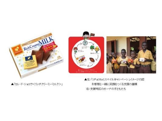 ※『1チョコfor1スマイルキャンペーン』:2008年に創業110年を記念したCSR活動として、カカオ生産国の子どもたちの笑顔ための商品売上連動型プロモーション「1チョコ for1スマイルキャンペーン」を開始。国際協力NGOと連携し、対象商品1個につき1円をカカオ生産国における子どもたちの教育支援、およびカカオ農家の自立支援に充てる活動を行ってまいりました 。この10年間で総額212,231,407円を支援、この度の「カレ・ド・ショコラ<リッチクリーミーミルク>」は、ガーナで支援した地域のカカオマスを使用しています。