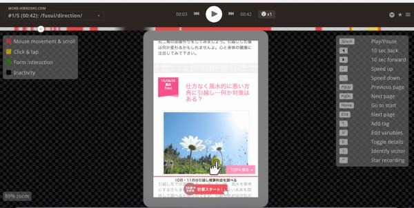 (3)“感覚的に使いやすいWebサイトデザイン”とは、必要なものが全て・わかりやすく配置されており、不要なものが全て取り除かれた状態を指します。Mouseflowによる分析改善手法を使うと、感覚的に使いやすいWebサイトデザインを行うことが出来るようになり、コンバージョン率が向上します。Mouseflowはあくまで分析ツールですが、改善手法をサポートブログや、サポートデスクが提供することで、分析から改善までを顧客にサービス提供致します。