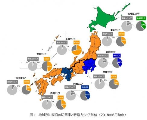 2018年6月時点の地域別の新電力への切替率と新電力のシェア首位を図1に示します。例えば、北海道エリアでは切替率は17%で、そのうち37%が北海道ガスでシェア首位となっています。