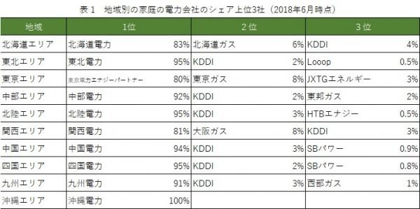 大手電力会社(旧一般電気事業者)を含めた地域別の電力会社のシェアを表 1に示します。