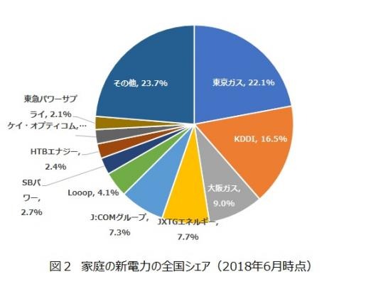 全国規模での家庭の新電力への切替率は、2018年6月時点で14%まで増加しています。切替先の内訳をみると、首位は22.1%の東京ガスで、次いでKDDI、大阪ガス、JXTGエネルギー、J:COMグループと、大手の都市ガス会社、通信会社、石油元売が上位を占めています。独立系ではLooopが6位に入っています(図2)。