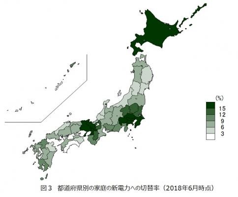 次に、家庭の新電力への切替率を図3に示します。地方別では、北海道地方、関東地方、関西地方が高い傾向にあります(図3)。都道府県別では神奈川県が24%と最も高く、次いで京都府(23%)、東京都(21%)となっています。
