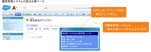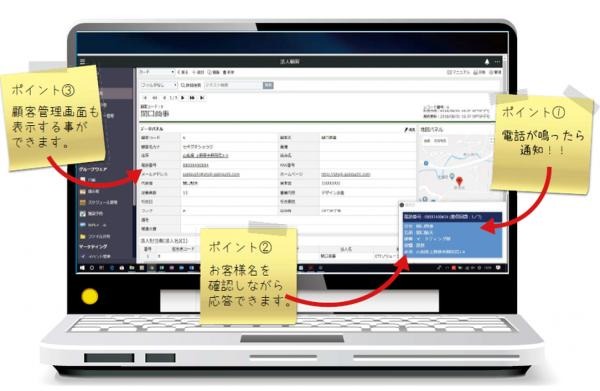 - 受電したタイミングで顧客情報を表示、各種CRMと連携することで「電話の応対力」をを向上させ、顧客満足度を高めることを目的としたサービスです。 -