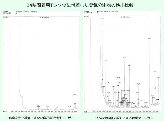 上記GCMSデータは二人の20代女性が同じ条件で体臭検査に臨んだ結果となります。左側は自己臭恐怖症のユーザー、右側は同性同年代平均を上回る基礎体臭物質分泌があり、尚且つパトム物質検出も見られる、やや強めの体臭を持つユーザーの臭気物質分泌データとなります。同じ20代女性でも個人によって体臭原因物質発露の状態は大きく異なります。