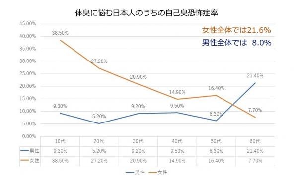 上のグラフにあるように、自己臭恐怖症は若い女性で突出しています。『10代女性』においての自己臭恐怖症の比率は、実に【4割近く】に及び、年齢を重ねるごとに下がっては来ますが、それでも50代までは男性の自己臭恐怖症の比率を大きく上回ります。