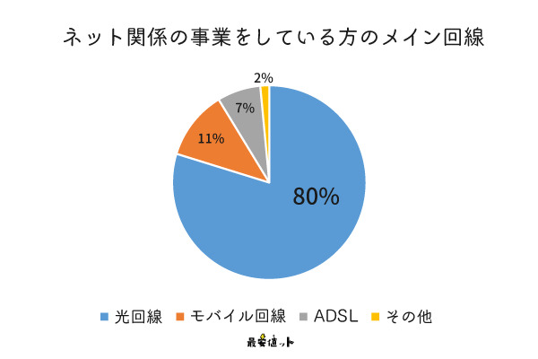 クラウドワークスでお仕事をされている方全体で使用しているメイン回線の比率は上グラフの通りで、「光回線:80%」「WiMAX:11%」「ADSL:7%」「その他:2%」という結果になり、光回線が全体比率の8割を占める結果となりました。