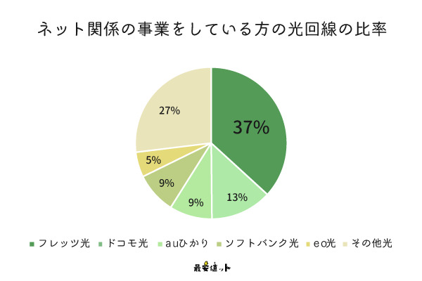 またその中の光回線の比率を見ると、「フレッツ光:37%」「ドコモ光:13%」「auひかり:9%」「ソフトバンク光:9%」「eo光:5%」「その他光:27%」というように、フレッツ光が37%と全体の1/3以上を占める結果となりました。