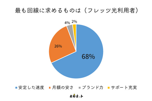 続いてフレッツ光回線利用者限定で「最も回線に求めるものは?」と質問したところ、「安定した速度:68%」「月額の安さ:26%」「ブランド力:4%」「サポートの充実:2%」という結果になり、多くの事業者が月額の安さよりも「安定した速度」を求めていることが分かりました。フレッツ光を契約している理由の一例として『事業をやる=フレッツ光のイメージが強かったから』『請求書払いができるから』『CMでよく「法人=フレッツ光」と宣伝されているから』などのご意見があり、全体的に【事業用のネット回線=フレッツ光】という印象が強くありました。