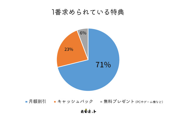 最後に、事業者が一番求めている新規入会時の特典が「月額割引:71%」「キャッシュバック:23%」「無料プレゼント(PCやゲーム機など):6%」という結果で、7割以上の方が、月額割引の特典を望んでいました。