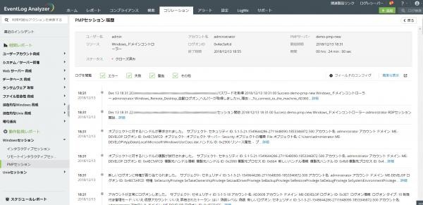 また、Password Manager Proを介さず、直接サーバーやネットワーク機器にアクセスした場合のログについても、同様にEventLog Analyzerのレポート画面からセッション毎に表示することができるようになりました。これによって、監査に必要となるログを抽出する作業が大幅に効率化されます。