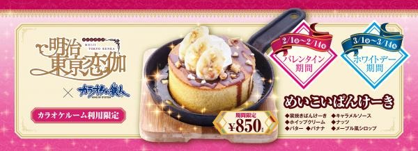 2月1日(金)~2月14日(木)の“バレンタイン期間”と3月1日(金)~3月14日(木)の“ホワイトデー期間”に、コラボフード「めいこいぱんけーき」を788円(税抜)[850円(税込)]で販売します。「めいこいぱんけーき」を注文した方には、ハート型キャラカードを全8種からランダムで1枚プレゼントします。