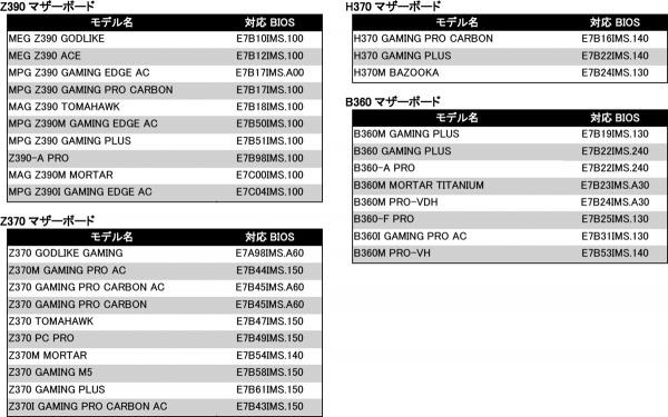 MEG Z390 GODLIKE / MEG Z390 ACE / MPG Z390 GAMING PRO CARBON / MPG Z390 GAMING EDGE AC / MPG Z390M GAMING EDGE AC / MPG Z390I GAMING EDGE AC / MAG Z390 TOMAHAWK / MAG Z390M MORTAR / Z390-A PRO