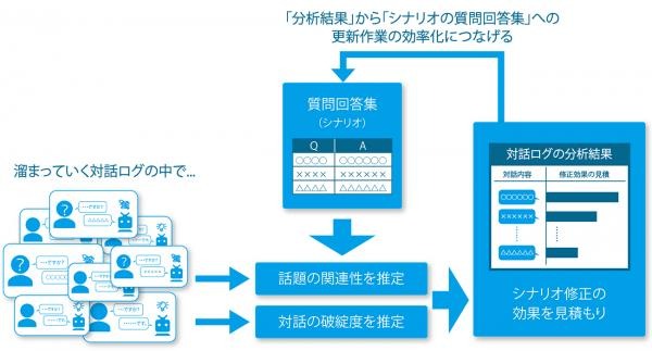 この機能により、シナリオ管理者は膨大な対話履歴(対話ログ)の中から、優先的に修正すべき対話を効率よく見つけ出すことが可能になります。この機能を使ってシナリオを効率的に修正することにより、AI対話システムの対応可能範囲を広げ、システム導入効果の拡大に寄与することが可能となります。