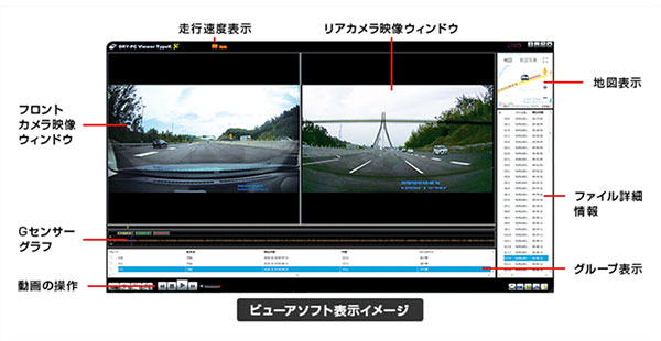 「DRY-TW7500d」「DRY-TW7500dP」は、GPS受信機能を搭載。専用ビューアソフト(Windows用)を利用すれば、前後2カメラの記録映像を同時再生で確認でき、さらに走行ルートも表示されます。また、GPSから時刻のデータを自動的に受信するので、本体ドライブレコーダーの時間合わせが不要です。