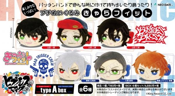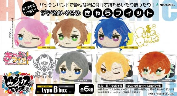 《typeA box》は[山田 一郎]・[山田 二郎]・[山田 三郎]・[碧棺 左馬刻]・[入間 銃兎]・[毒島 メイソン 理鶯]の全6種、《typeB box》は[飴村 乱数]・[夢野 幻太郎]・[有栖川 帝統]・[神宮寺 寂雷]・[伊弉冉 一二三]・[観音坂 独歩]の全6種からそれぞれランダムで1つ封入されます。