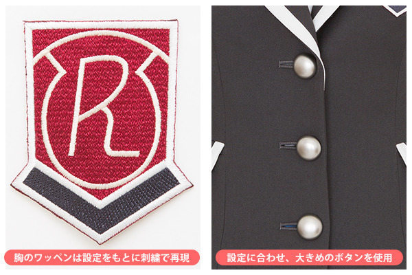 ジャケットには、設定通りに刺繍で再現した校章ワッペンつき。