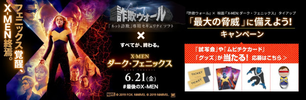「詐欺ウォール」は、日々驚くほど進化するネット詐欺の“驚異”から、あなたを守るソフトです。X-MENシリーズで過去最大の脅威に立ち向かう『X-MEN:ダーク・フェニックス』の公開(2019年6月21日)を記念し、試写会、劇場鑑賞券(ムビチケカード)、X-MENグッズを抽選でプレゼントします。応募方法はキャンペーンサイトをご覧ください。