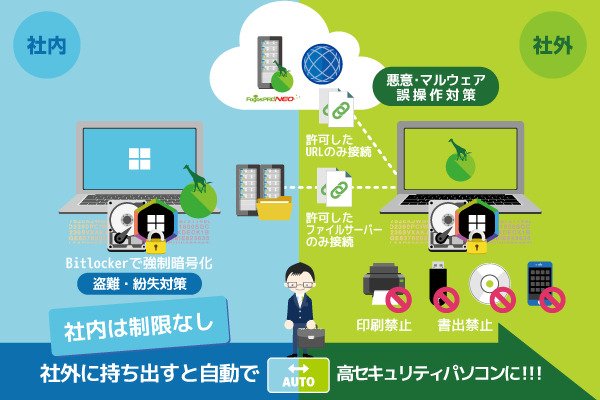 「FogosPRO NEO」は社内外を自動判別し、お客様は意識しないで持ち出しパソコンの情報漏洩対策を実現することが出来ます。