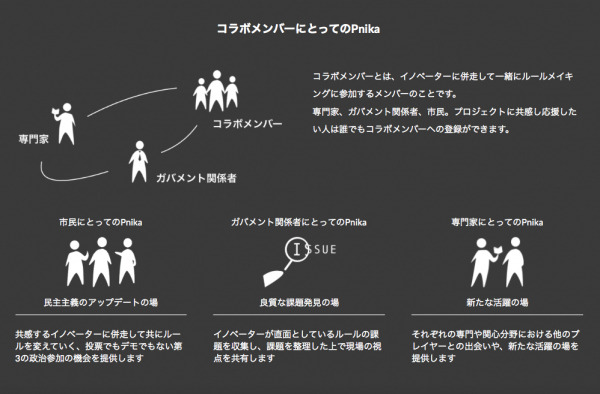 Pnikaの趣旨に共感いただける方は、「会員登録」ボタンから、コラボメンバー登録が可能です。プロジェクトをフォローすると、進捗が都度通知されます。専門家には、それぞれの専門や関心分野における「新たな活躍の場」を、ガバメント関係者には、イノベーターが直面するルールの課題を収集できる「良質な課題発見の場」を、市民には、共感するイノベーターに併走して共にルールを変えていく、投票でもデモでもない第3の政治参加の機会である「民主主義のアップデートの場」を提供します。