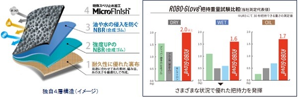 手袋は、故障の原因となる水や油などの異物侵入を防ぎ、強度を保つ合成ゴムを含む独自の特殊4層構造となっています。