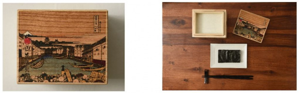 蓋には葛飾北斎作「冨嶽三十六景-江戸日本橋」の浮世絵柄に山本海苔店のロゴをあしらいました。