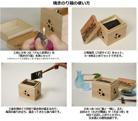 焼きのり箱とみやこ炭のセットや焼きのり箱を使ってお召し上がりいただきたい極上海苔のセットをご用意しております。