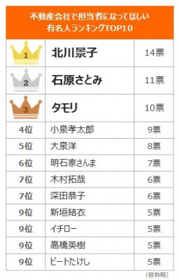 また、不動産・住宅関連会社のCMに出演している有名人では、アイダ設計の小泉孝太郎さんがTOP10入りした他、三井不動産住宅グループの櫻井翔さん、大東建託の中井貴一さん、FUKUYAの三浦友和さん(各4票)、センチュリー21のケイン・コスギさん、ハウスドゥの古田敦也さん、生和コーポレーションの松岡修造さん、東急リバブルの山口智充さん(各2票)、飯田グループの市川海老蔵さん、ホームメイトの桐谷美玲さん、シノケングループの佐々木蔵之介さん、三菱地所の柴咲コウさん、東建コーポレーションの中村雅俊さん、住友林業の長澤まさみさん、トヨタホームの吉田羊さん(各1票)の名前が挙がりました。