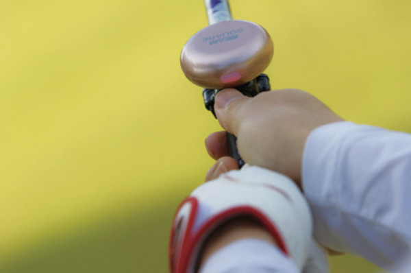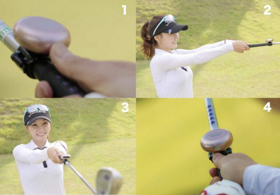 <BEAM SQUARE>が取り付けられたクラブを打球を打つ方向に対してまっすぐ向けたところでボタンを押し動作させ、高さを変えずにアドレスする位置まで身体を回転させます(戻します)。その時にセンサーの色や点滅の速度によって正しいアドレスに構えられているかチェックをすることができます。赤色の点滅が速くなればなるほど90度に近づき、緑色に変わった場所が打球方向にシャフトを向けた位置から90度の位置となります。