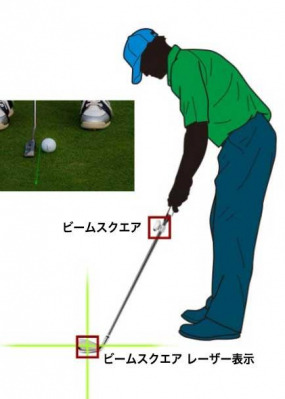 <BEAM SQUARE>は、ラウンド前や練習時に、<BEAM SQUARE>から照射される十字ビームの垂直方向と平行方向のラインを、打ち出しの方向とスクエアにスタンスを取るための身体の向きに合わせることができるので自身がスクエアに構えられているかのチェックができ、また、ビームを照射したままスイングすることで自分のスイングの軌道を確認することができるゴルフ練習器具です。