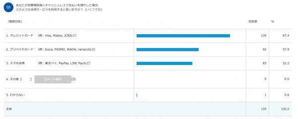続いて、この「キャッシュレス決済をこれまでより積極的に使おうと思っている」77.1%の回答者に対して【あなたが消費増税後にキャッシュレスで支払いを増やした場合、どのような決済サービスを利用すると思いますか?(いくつでも)】と聞いたところ、「クレジットカード」と回答した人が、87.4%、「プリペイドカード」と回答した人が57.9%、「スマホ決済」と回答した人52.2%という結果になりました。