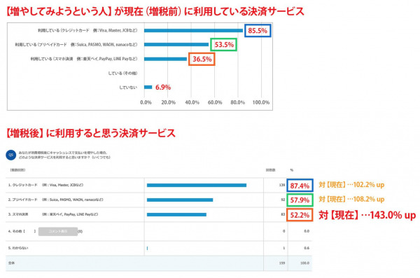一番使われる決済手段がクレジットカードであることは、消費増税前後で変化はありませんでした。しかし「現在の手段」と「増税後に増やそうと思っている決済手段」で比較すると、クレジットカードが102.2%アップ(85.5%→87.4%)、プリペイドカードが108.2%アップ(53.5%→57.9%)に対し、スマホ決済は143%アップ(36.5%→52.2%)と伸び率が一番大きいことがわかりました。消費増税後はスマホ決済がクレジットカードに次ぐキャッシュレス第2の決済手段になりそうです。