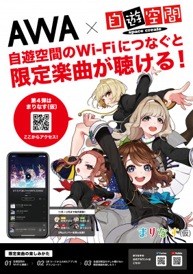 本取り組みは、自遊空間の店舗において無料で使用できるFREE Wi-Fi サービスに接続すると、どなたでも「AWA」が提供するスペシャルコンテンツを聴けるというものです。2019 年11 月1 日(金)より、歌って踊れるアーティストユニットまりなす(仮)の未配信楽曲とオリジナルヴォイスの配信を開始。各メンバーが5 カ月に渡り月替わりで、楽曲、オリジナルヴォイス、プレイリストを担当します。