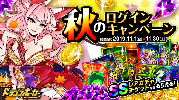 株式会社アソビズム(本社:東京都千代田区、代表取締役:大手智之)は、App Store・Google Playにて好評配信中のリアルタイム合体カードバトル『ドラゴンポーカー』で、2019年11月1日(金)より 「秋のログインキャンペーン」を開催いたします。