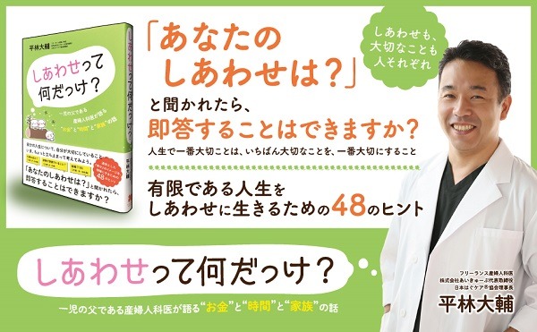 筆者はフリーランス産婦人科医として、病院の時間に縛られず、週の半分を医師、そして残った日を家族と過ごすという生活をしながら、活動しています。このような働き方になる前までは、バリバリに医師として働きづめの日々を送っていましたが、お産の現場や不妊治療、婦人科系の疾患の治療に携わる中で、「しあわせとは何なのだろう?」と考えるようになりました。そして自身の子どもが生まれたときに、筆者は自分の中のしあわせについて明確な答えを出しました。「しあわせ」が明確になったことによって、彼自身の働き方や時間の使い方も変化したのです。