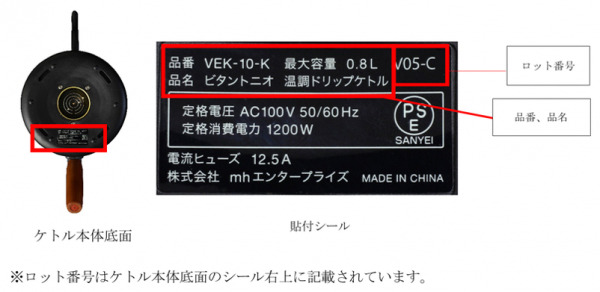 表示位置: ケトル本体底面の貼付シールに品番、品名、ロット番号記載