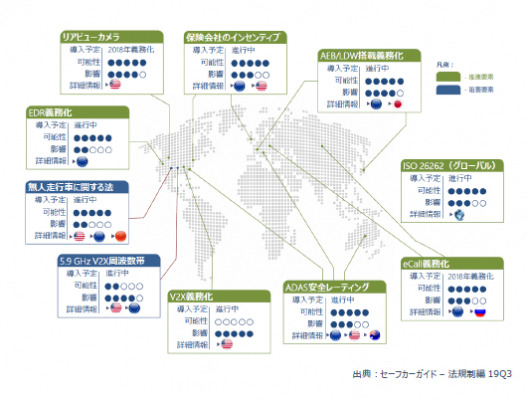 SBDでは車載アクティブセーフティシステムへの法規制の影響に関する調査・分析を継続的に行っており、最新情報をまとめた「セーフカーガイド:法規制編」を四半期ごとに発行しています。