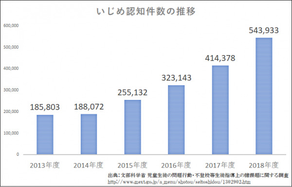 2019年10月17日に文部科学省が発表した児童の問題行動・不登校に関する調査(2018年度)によると、いじめの認知件数は過去最大の約54万件に達し、前年度より約13万件増となりました。