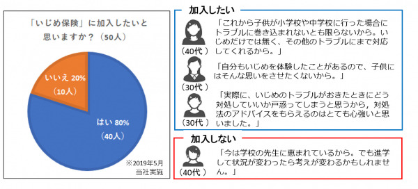 「いじめ保険」に対するアンケートを実施した結果、80%が加入したいとの回答がありました。