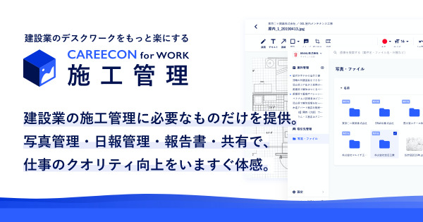 建設業界では、施工現場で撮影した大量の写真を整理し、それらを添付して報告書をまとめるデスクワークが必要不可欠です。「CAREECON for WORK 施工管理」は、建設業のデスクワークをもっと楽にする新しい施工管理サービスになります。