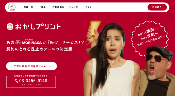 ノベルティ商品は、ボールペンやティッシュなどが主流ですが、おかしプリントの提供するオリジナルお菓子は、知名度抜群の「お菓子ブランド」を使うことができる為、初めて商談するお客様でも「足止め」し、心を開いてくださり会話を生むことができることが特徴です。今回、森永製菓を代表する商品をラインアップに加えることで、契約のとれる「足止め」ツールとしての魅力をより一層強化しました。