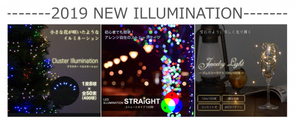 花のように美しく光る「クラスターイルミネーション」や、1つの電球が様々な色に変化する「RGBイルミネーション」、宝石のように美しく光り輝く「ジュエリーライト」が仲間入り。