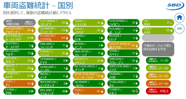 車両盗難統計:今までと新たに公表されたデータを基にした国別の車両盗難件数と盗難リスク、盗難リスクの高いブランドおよび車種を示す。