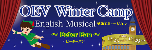 今年のOEVウィンターキャンプのテーマは、「Challenge & Believe~新しい自分への挑戦!自分を信じて、仲間を信じて!~」です。ピーターパンの物語のように、仲間と様々な挑戦を楽しみながら、新しい自分を発見できるプログラムです。ミュージカルという創作活動を通して、ぜひ「自己表現」や「協調」なども同時に学んでみませんか。