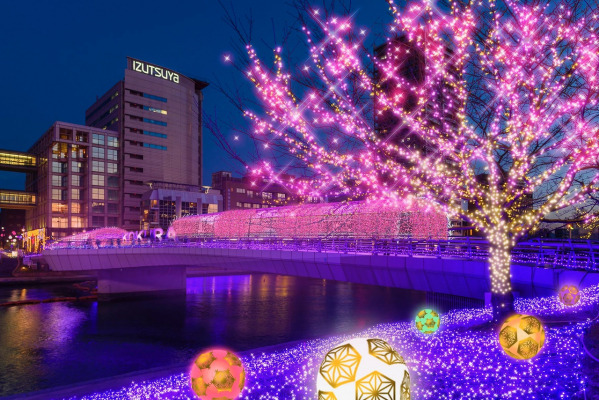 2018年、長崎市や札幌市とともに「日本新三大夜景都市」に認定された北九州市。同イルミネーションイベントは「日本夜景遺産」にも選ばれており、2019年のテーマは「灯る。ひろがる。光のまち。」。小倉城、平成中村座公演会場に近接する紫川では自然と伝統を軸に和のイメージを表現しています。