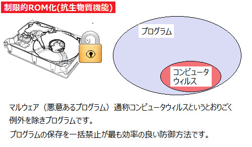 コンピュータウィルスは単体では犯罪目的で開発された単なるプログラムです。ですからディスク装置に保存する必要があります。ネット経由で一時的にメモリ上に寄生しても電源OFFで消えます。つまりプロ グラムの書き込みを禁止すれば感染できません。まさに制限的 ROM化は抗生物質の役割をします。