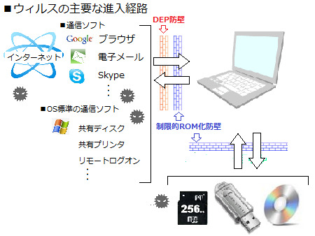 DEPをすり抜けたマルウェアが本格的に悪さをするためにはディスク装置にウィルスプログラムを書き込む必要があります。こ の時に制限的ROM化機能が最後の防衛線を張ります。
