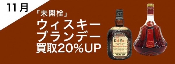 11月のキャンペーンは未開栓ウィスキー・ブランデーを対象に通常査定金額から20%UPで買取させていただきます。