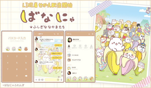 テレビ東京系「きんだーてれび」にて放送中のショートアニメーション「ばなにゃ」がLINE着せかえとなって登場!新しい仲間たちが大集合したキービジュアルを使用し、メニュー画面やパスコード画面に“ふしぎななかまたち”がいっぱいの「ばなにゃ」好きにはたまらない着せかえとなっております。是非、LINE着せかえで「ばなにゃ」をお楽しみください!