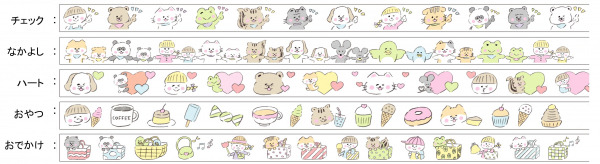 テープ幅は、10mm幅。太幅だからこそできる繊細な柄デザインで、えちがわのりゆきさんのほんわかしたタッチやニシワキタダシさんのユーモラスな動きのイラストを表現。デコレーションの幅が広がりました。
