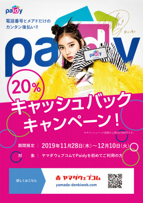 ヤマダウェブコムは、全国展開ならではの豊富な品揃えと、幅広い配送ネットワークが好評の、ヤマダ電機公式通販サイトです。今後新たな顧客層の開拓を目指し若年層の集客に注力すべく、同サイトではPaidyを導入いたしました。クレジットカード以外の後払い決済導入は今回が初めてとなります。このたびの導入を記念し、11月28日(木)から12月10日(火)の期間中にヤマダウェブコムで初めてPaidy決済をご利用いただいたお客様を対象に20%のキャッシュバックをいたします。また、こちらのキャンペーンに先駆けて本日から実施の「Paidy 5周年記念20%オフキャンペーン」( https://paidy.com/lp/5th_anniv_top )は、18日(月)からヤマダウェブコムも対象店となります。